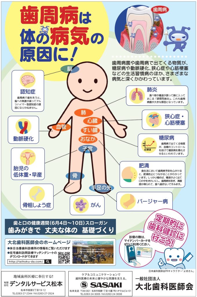 大北歯科医師会では、地域の皆さまに向けて歯と口の健康について考えていただくきっかけとなるよう、大糸タイムス新聞折込にて広報チラシを配布いたしました。(2025年6月4日付)
